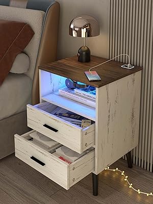 Amazon Com Lvsomt Smart Nightstand With Charging Station Bedside Table With 2 Drawers Led End Side Table With Open Shelf Modern Night Stand For Bedroom Living Room Wood White Home Kitchen
